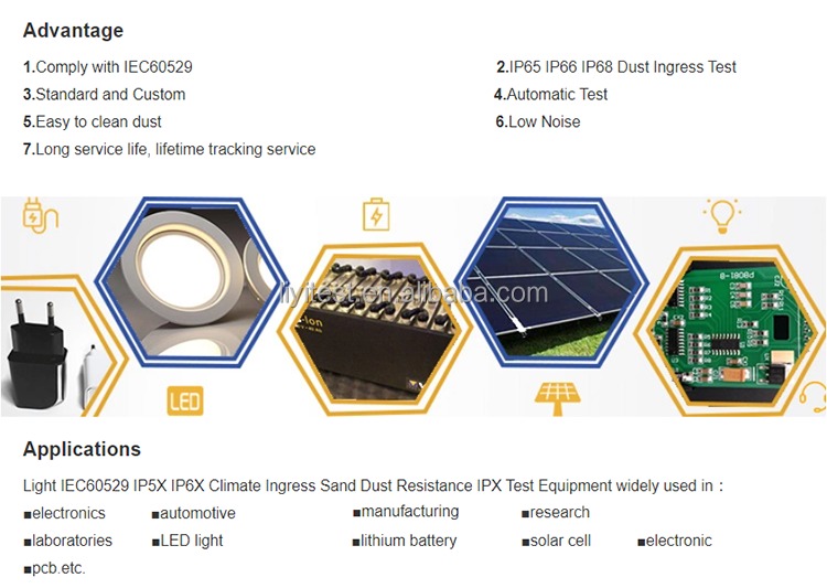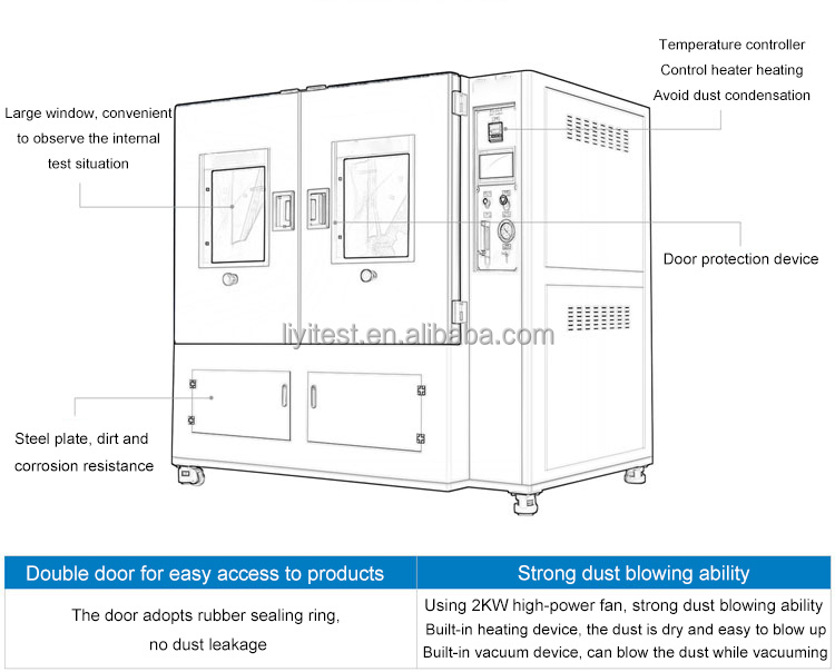 LIYI सिमुलेटेड सैंड और डस्ट टेस्ट चैंबर को GB4706, GB2423, GB7000.1, IEC60529 मानकों के अनुसार इंजीनियर किया गया है और IPX3 और IPX4 धूल परीक्षण आवश्यकताओं को पूरा करता है। यह उपकरण नियंत्रण कैबिनेट, घरेलू उपकरणों, कम वोल्टेज वाले विद्युत उपकरणों, ऑटोमोबाइल, लैंप और लालटेन, मोटरसाइकिल के पुर्जों और अन्य बाहरी खोलों के परीक्षण के लिए आदर्श है। चैंबर स्थिर या परिवर्तनीय दबाव बनाए रखता है और इनडोर कम-सांद्रता वाले धूल प्रदूषण परीक्षणों के लिए उपयुक्त है।